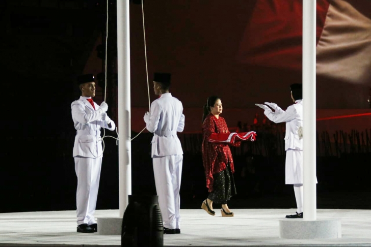 Menko Puan memasuki arena stadion GBK dengan membawa bendera merah putih secara seksama. Diiringi dengan visualisasi video yang menjelaskan makna bendera merah putih. Narasi Menko Puan berisikan bahwa warna merah yang terdapat pada bendera Indonesia melambangkan keberanian, dan warna putih melambangkan kesucian. "Jadilah simbol persatuan, berikan warna pada dunia", tutur Menko Puan.