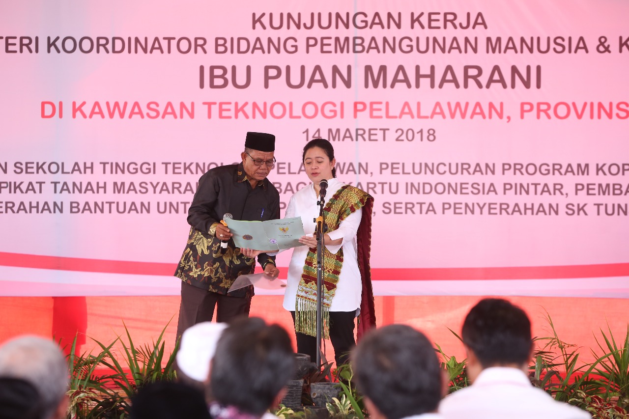 Demikian diungkapkan Menteri Koordinator Bidang Pembangunan Manusia dan Kebudayaan (Menko PMK) Puan Maharani saat memberikan secara simbolis 1.440 sertifikat tanah kepada masyarakat Pelalawan. “Dengan sertifikat di tangan para petani, maka Ibu dan Bapak dapat lebih tenang dalam menggarap lahannya, sehingga dapat meningkatkan produktifitas lahan dan kesejahteraan,” ujarnya. Pemerintah sendiri menargetkan sertifikasi lahan pada tahun ini sekitar 7 juta sertifikat bidang lahan. Khusus untuk Kabupaten Pelalawan telah disiapkan lebih dari 4.000 sertifikat.