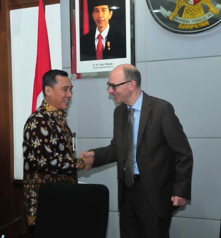 Jakarta, 30 Januari – Sesmenko PMK Sugihartatmo (kiri) menyambut kehadiran Jurgen Stetten (kanan) dengan bersalaman sebelum dilakukan penandatanganan MoU Saling Pengertian antara Kemenko PMK dengan Friedrich- Ebert-Stiftung (FES) tentang Program Kerjasama pembangunan, Jumat (30/1/2015) di kemenko PMK, Jl. Medan Merdeka Barat No.3, Jakarta. (Gs).