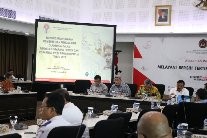 Jakarta (07/08) – PON dan PEPARNAS Papua 2020 merupakan hajat nasional yang diselenggarakan di Papua. Mengingat kekhususannya, Papua masih membutuhkan dukungan yang besar dari seluruh pemangku kepentingan, terutama Kementerian dan Lembaga terkait demi suksesnya penyelenggaraan PON dan PEPARNAS Papua 2020.