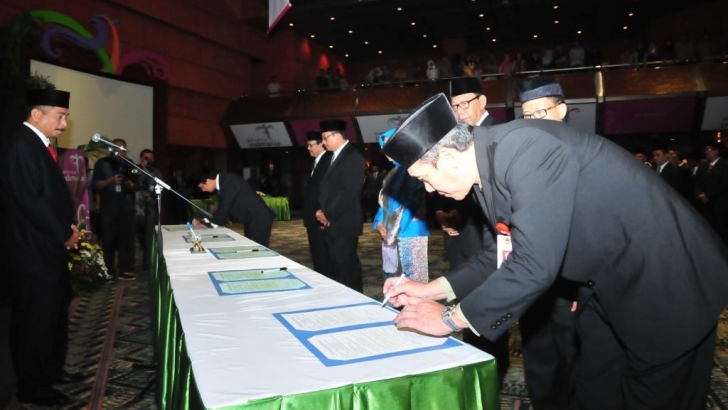 Jakarta, 5 Juni – Sesmenko PMK Sugihartatmo (kanan) sebagai Saksi pada Sumpah/Janji Jabatan tampak menandatangani Berita Acara Pelantikan Pejabat Struktural dan Pengurus KORPRI di lingkungan Kementerian Pariwisata, Jumat, 5/6/2015 pagi di Balairung Soesilo Soedarman Kementerian Pariwisata, Jl. Medan Merdeka Barat no.17, Jakarta. Tampak Menteri Pariwisata Arief Yahya (kiri) menyaksikan penandatanganan tersebut