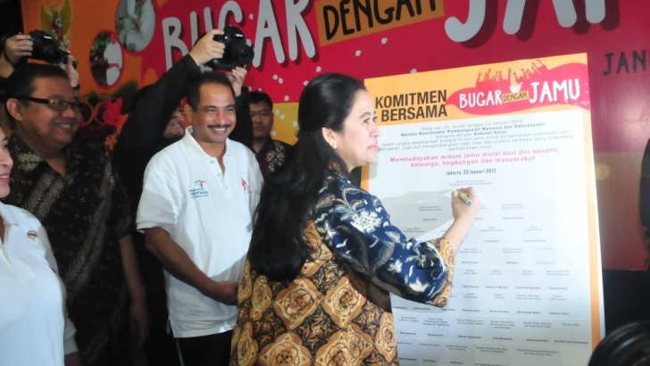 Pada kesempatan tersebut, Menko PMK bersama Menteri Kabinet Kerja dan Pejabat lainnya menandatangani “Komitmen Bersama Membudayakan Minum Jamu Dari Diri Sendiri, Keluarga, Lingkungan dan Masyarakat”. Acara ditutup dengan minum jamu bersama seluruh tamu dan undangan.(Humas).