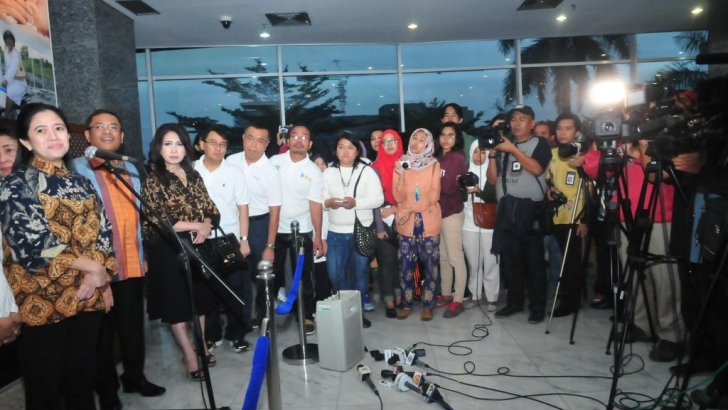 Jakarta, 23 Januari – Menko PMK Puan Maharani (kiri) usai acara Jumat Minum Jamu Bersama, memberikan keterangan pers dan tampak  mendampingi antara lain Menteri Kesehatan Nila F. Moeloek, Menteri Perindustrian M. Saleh Husin dan jajaran para pengusaha jamu. (Gs).
