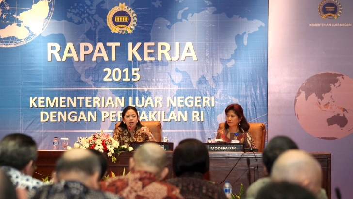 Jakarta, 4 Februari 2015 - Menteri Koordinator Bidang Pembangunan Manusia dan Kebudayaan Puan Maharani memberikan arahan dan masukan pada rapat kerja pimpinan Kementerian Luar Negeri dengan Kepala Perwakilan Republik Indonesia Tahun 2015, yang bertempat di Ruang Nusantara Kementerian Luar Negeri pada Rabu, 4/2/2015.(ng)