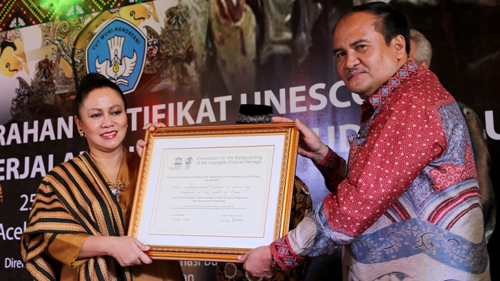 Jakarta, 25 September 2014 - Deputi Bidang Koordinasi Kebudayaan, Pariwisata, Pemuda dan Olahraga Dr. Haswan Yunaz  menyerahkan Sertifikat Tari Saman dari UNESCO sebagai Warisan Budaya Dunia kepada Wamendikbud Wiendu Nuryanti, di Anjungan Provinsi Aceh, TMII, Jakarta. (ole / Foto: Bagian Data dan Informasi Ditjen Kebudayaan)