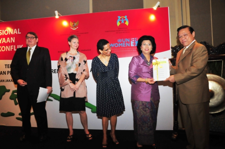 Jakarta, 6 Oktober - Menko Kesra HR. Agung Laksono (kanan) dan Menneg Pemberdayaan Perempuan dan Perlindungan Anak Linda Amalia (kedua kanan) bersama sama memegang buku Rencana Aksi Nasional (RAN) Perlindungan dan Pemberdayaan Perempuan dan Anak Dalam Konflik Sosial, Senin (6/10/2014) pagi di Hotel Pullman, Jakarta. Hadir dalam acara tersebut antara lain Deputi Menko Kesra Bidang Koordinasi Lingkungan Hidup dan Kerawanan Sosial Willem Rampangilei, Deputi Menko Kesra Bidang Koordinasi pemberdayaaan perempuan dan Perlindungan Anak Ina Hernawati, Perwakilan PBB untuk Indonesia dan Perwakilan dari negara Norwegia. (Foto : Gs).