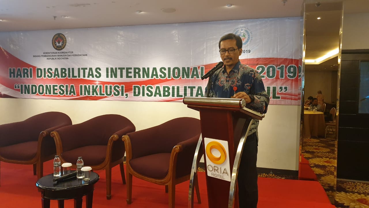 Jakarta (21/11) -- Asisten Deputi (Asdep) bidang Pemberdayaan Disabilitas dan Lanjut Usia Kemenko PMK, Ade Rustama memberikan sambutan pada Seminar Hari Disabilitas Internasional (HDI) 2019. Acara dilaksanakan di Hotel Oria, Jakarta, Kamis Pagi (21/11). Peringatan HDI sendiri jatuh setiap tanggal 3 Desember dan tahun ini peringatan HDI di Indonesia mengusung tema Indonesia Inklusi, Disabilitas Unggul.