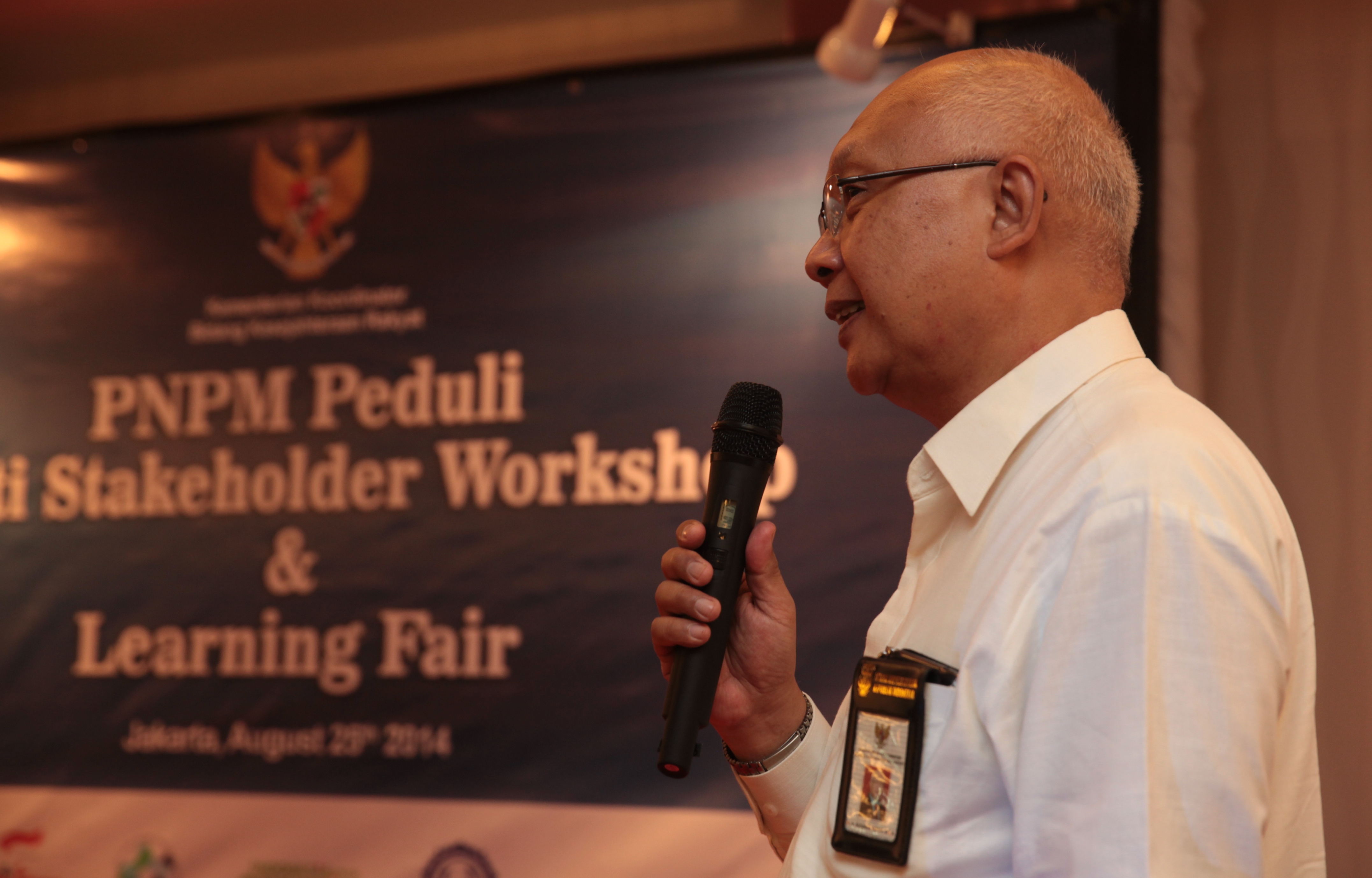Jakarta, 25 Agustus 2014 - Deputi Menko Kesra Bidang Penanggulangan Kemiskinan dan Pemberdayaan Masyarakat Sujana Royat yang juga sebagai ketua Kelompok Kerja (Pokja) Pengendali PNPM Mandiri membuka Lokakarya Pemangku Kepentingan Program Nasional Pemberdayaan Masyarakat (PNPM) Peduli di Hotel Oria, Jakarta, Senin (25/8). Turut berpartisipasi dalam lokakarya tersebut adalah donor PNPM Peduli, Organisasi Masyarakat Sipil (OMS), dan penerima manfaat.