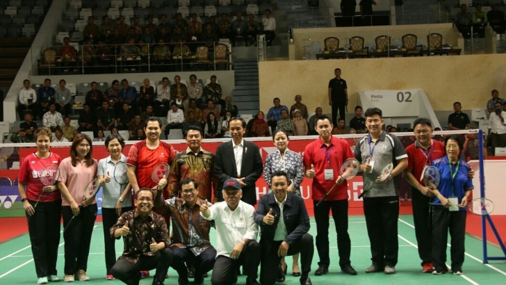 memasuki venue lapangan Istora dengan menyanyikan lagu Indonesia raya sebagai acara pembuka sebelum meresmikan serta menandatangani prasasti.