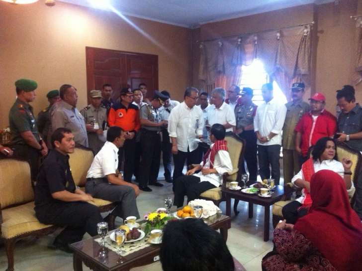 Jakarta (31/10) -- Terkait dengan bencana erupsi Gunung Sinabung, Deputi Bidang Koordinasi Lingkungan Hidup dan Kerawanan Sosial Willem Rampangilei (berkaos oranye) yang ikut dalam kunjungan Presiden Jokowi pada Rabu (29/10), memberikan laporan mengenai hasil kunjungan kerja tersebut.