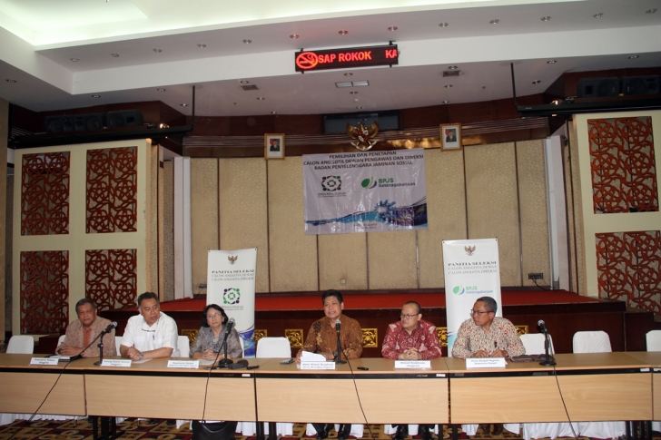 Jakarta (5/11) - Ketua Panitia Seleksi (Pansel) Calon Anggota Dewan Pengawas dan Calon Anggota Direksi BPJS Ketenagakerjaan Abdul Wahab Bangkona didampingi Anggota Pansel Calon Anggota Dewan Pengawas dan Calon Anggota Direksi BPJS Kesehatan Prasetijono Widjojo, Anggota Pansel Calon Anggota Dewan Pengawas dan Calon Anggota Direksi BPJS Ketenagakerjaan Ahmad Syakhroza, Anggota sekaligus Wakil Ketua Pansel Calon Anggota Dewan Pengawas dan Calon Anggota Direksi BPJS Kesehatan Suahartini Hadad, Untung Suseno Sutarjo Anggota Pansel Calon Anggota Dewan Pengawas dan Calon Anggota Direksi BPJS Kesehatan, dan Sekretaris Pansel Ponco Respati memberikan keterangan pers kepada media mengenai segera dibukanya pendaftaran bagi Calon Anggota Dewan Pengawas dan Calon Anggota Direksi BPJS Kesehatan & Ketenagakerjaan di Auditorium PPSDM Kementerian Kesehatan, Jakarta. (humas/dwi)