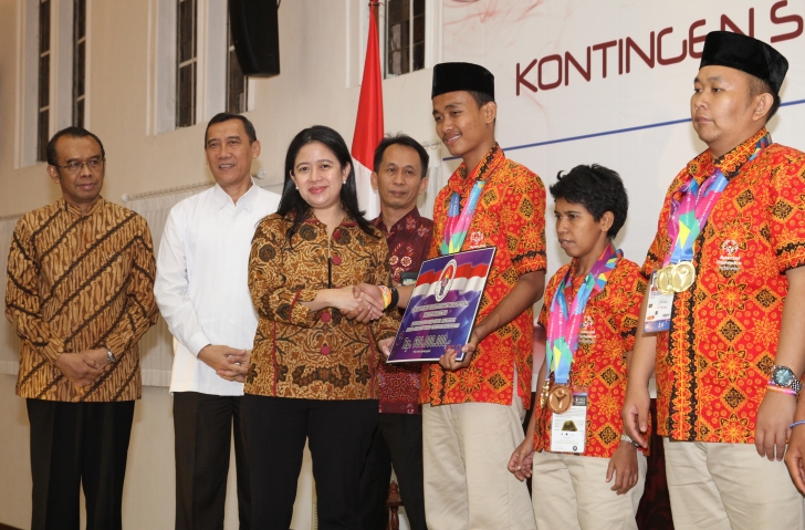 Jakarta (05/08) -- Menteri Koordinator Bidang Pembangunan Manusia dan Kebudayaan Puan Maharani memberikan bonus simbolis dari Kementerian Pemuda dan Olahraga kepada Dhimas Prasetyo, atlet bulutangkis yang menyabet 3 medali emas pada ajang Special Olympics World Games 2015 di Los Angeles, Amerika Serikat. Pada kejuaraan dunia multi cabang khusus kaum disabilitas tersebut, Kontingen Spesial Olympics Indonesia 2015 berhasil membawa pulang 19 medali emas, 12 perak, dan 5 perunggu. (humas).