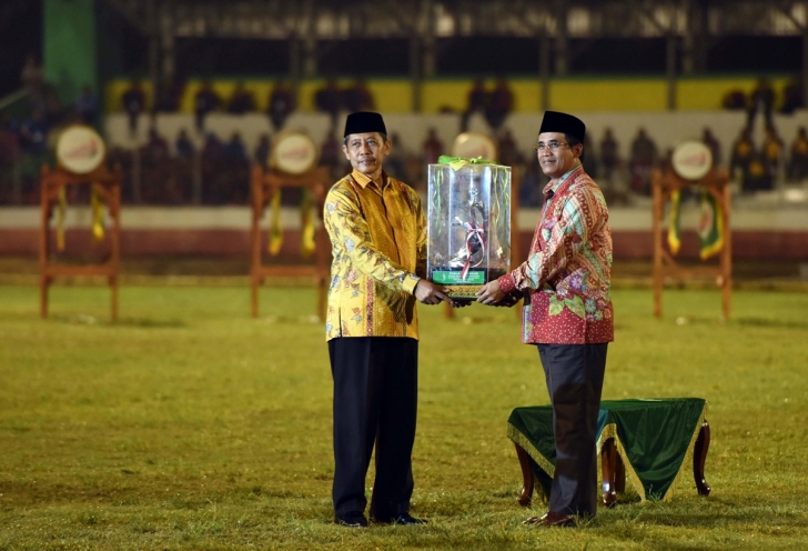 Jakarta (24/10) - Deputi Bidang Pendidikan dan Agama Agus Sartono (kanan) menyerahkan piala bergilir dari Juara Umum POSPENAS VI Kepada Ketua Panjatapnas POSPENAS di Stadion Maulana Yusuf, Serang Banten (22/10).
