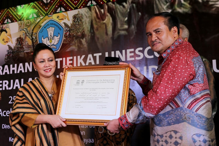 Jakarta, 25 September 2014 - Deputi Bidang Koordinasi Kebudayaan, Pariwisata, Pemuda dan Olahraga Dr. Haswan Yunaz menyerahkan Sertifikat Tari Saman dari UNESCO sebagai Warisan Budaya Dunia kepada Wamendikbud Wiendu Nuryanti, di Anjungan Provinsi Aceh, TMII, Jakarta. (ole / Foto: Bagian Data dan Informasi Ditjen Kebudayaan)