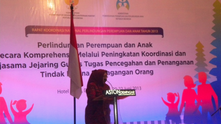 Denpasar, 21 Juni 2013. Deputi Bidang Koordinasi Pemberdayaan Perempuan dan Kesejahteraan Rakyat, Kemenko Kesra (dr. Ina Hernawati, MPH) sebagai ketua panitia dalam pembukaan Rakornas.