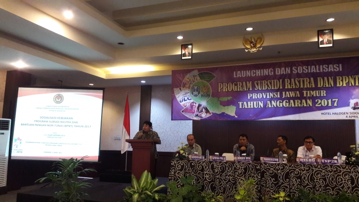 Sidoarjo (04/04)--- Asisten Deputi bidang Kompensasi Sosial pada Kedeputian bidang Koordinasi Penanggulangan Kemiskinan dan Perlindungan Sosial Kemenko PMK, G Fajar Suryono, pagi tadi menjadi salah satu Nara Sumber dalam Rakor Launching Dan Sosialisasi Program Subsidi Rastra Dan Bantuan Pangan Non Tunai (BPNT) Provinsi Jawa Timur Tahun 2017 di Kota Surabaya, Jawa Timur.