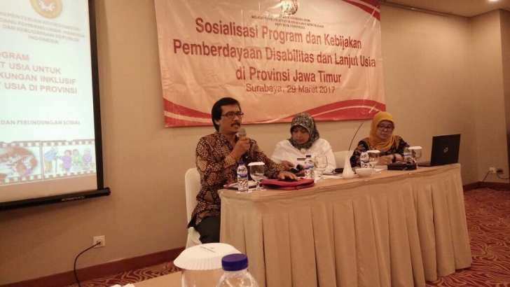 Surabaya (29/03)--- Asisten Deputi bidang Pemberdayaan Disabilitas dan Lansia pada Kedeputian bidang Koordinasi Penanggulangan Kemiskinan dan Perlindungan Sosial Kemenko PMK, Ade Rustama, pagi tadi membuka rapat koordinasi terkait sosialisasi program dan kebijakan pemberdayaan bagi penyandang disabilitas dan lansia untuk peningkatan akses lingkungan inklusif bagi penyandang disabilitas dan lansia Provinsi Jawa Timur di Kota Surabaya.