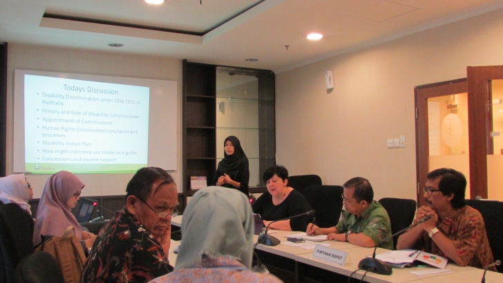 akarta (09/11)---Deputi bidang Koordinasi Penanggulangan Kemiskinan dan Perlindungan Sosial, Tb. A. Choesni, didampingi Asisten Deputi bidang Koordinasi Pemberdayaan Disabilitas dan Lansia Kemenko PMK, Ade Rustama; bersama dengan Head of Unit Disability and Community Inclusion Flinders University, Australia, Caroline Ellison; pagi ini hadir dalam Rapat Koordinasi Lintas Kementerian/Lembaga terkait Pembahasan Rencana Tindak Lanjut Pelaksanaan Undang-Undang No.