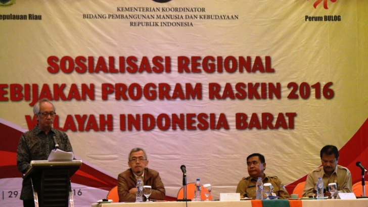 Batam, (29/2)—Deputi Menko PMK Bidang Koordinasi Penanggulangan kemiskinan dan Perlindungan Sosial, Tubagus Achmad Choesni memberikan sambutan pada pembukaan acara Sosialisasi Regional Kebijakan Program Raskin 2016 Wilayah Indonesia Barat, di Batam, senin pagi (29/2).