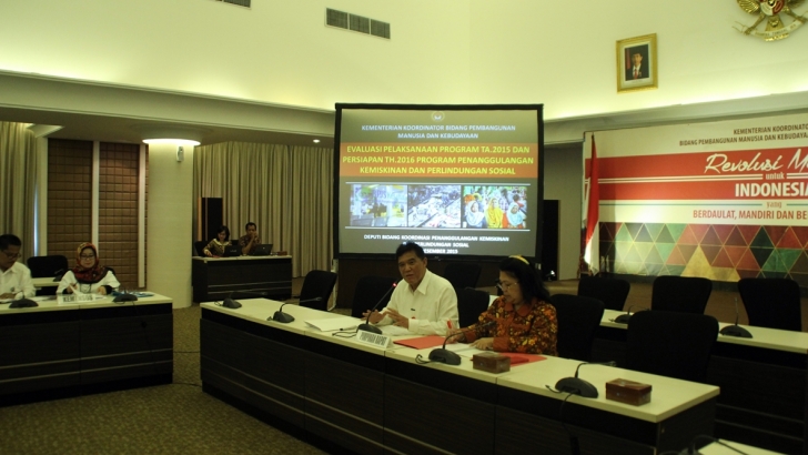 Jakarta (16/12) - Plt Deputi Menko PMK Bidang Koordinasi Penanggulangan Kemiskinan dan Perlindungan Sosial, TB Rachmat Sentika saat sedang memberikan arahan pada Rapat Koordinasi Evaluasi Pelaksanaan Progeram Penanggulangan Kemiskinan dan Perlindungan Sosial T.A 2015 dan Persiapan Program 2016 di Ruang Rapat Utama Kemenko PMK. Hadir dalam rakor tersebut K/L terkait seperti Kemensos, Bappenas, KemenPU & Pera, KemenPP & PA, dan Kemendagri.
