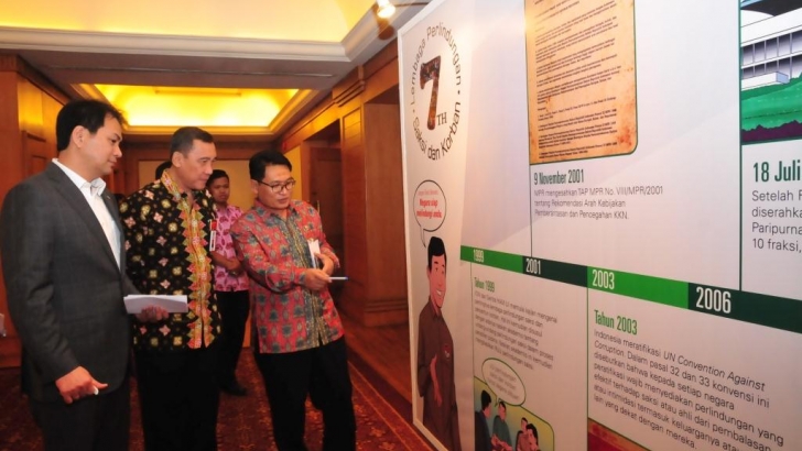 Jakarta, 15 September,- Sesmenko PMK Sugihartatmo (tengah) disela sela mewakili Menko PMK sebagai salah satu nara sumber Seminar Sehari LPSK menyempatkan diri meninjau Pameran perjalanan tujuh tahun Lembaga perlindungan Saksi dan Korban (LPSK). Dalam kesempatan tersebut Sesmenko PMK didampingi Ketua LSPK Abdul Haris Semendawai (kanan) dan Ketua Komisi III DPR RI Aziz Syamsudin (kiri).(Gs)
