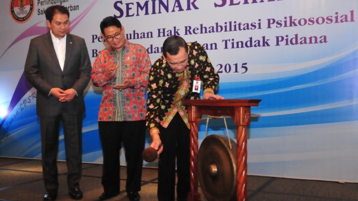 Jakarta, 15 September, - Menko PMK yang diwakili Sekretaris Kemenko (Sesmenko) PMK Sugihartatmo memukul Gong (kanan) usai memberikan Keynote Speech dalam Seminar Sehari Lembaga Perlindungan Saksi dan Korban (LPSK) sebagai tanda dibukanya Seminar Sehari LPSK yang bertajuk “pemenuhan Hak Rehabilitasi Psikososial Bagi Saksi dan Korban Tindak Pidana”, Selasa, 15/9/2015, di Jakarta. Sesmenko didampingi Ketua LPSK Abdul Haris Semendawai (tengah) dan Ketua Komisi III DPR RI Azis Syamsudin(kiri). (Gs).