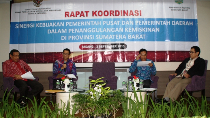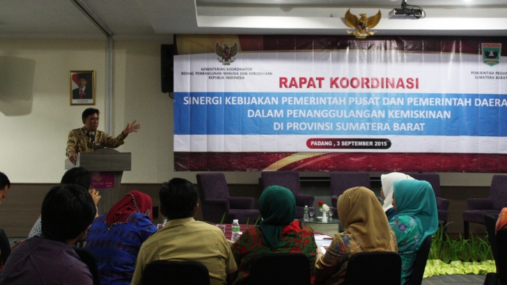 Padang, 3 September 2015 - Plt. Deputi Menteri Koordinator Bidang Pembangunan Manusia dan Kebudayaan (Menko PMK) urusan Penanggulangan Kemiskinan dan Perlindungan Sosial Tb. Rahmat Sentika memberikan arahan dan sambutan sekaligus membuka secara resmi Rapat Koordinasi (Rakor) Penanggulangan Kemiskinan dengan tema Sinergi Kebijakan Pemerintah Pusat dan Pemerintah Daerah dalam Penanggulangan Kemiskinan di Propinsi Sumatera Barat yang diselenggarakan pada Kamis (3/9/2015).