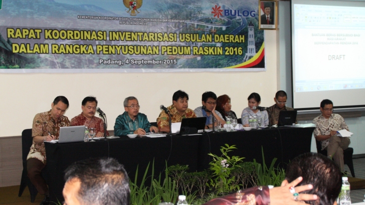 Padang, 4 September 2015 - Staf Ahli Menteri Koordinator Bidang Pembangunan Manusia dan Kebudayaan (Menko PMK) Bidang Usaha Kecil, Mikro, Menengah dan Ekonomi Kreatif Gunarso Djoko Santoso memberikan sambutan sekaligus membuka secara resmi Rapat Koordinasi (Rakor) Inventarisasi Usulan Daerah dalam Rangka Penyusunan Pedoman Umum (Pedum) Raskin 2016 yang diselenggarakan pada Jum'at (4/9/2015) di Padang, Sumatera Barat.