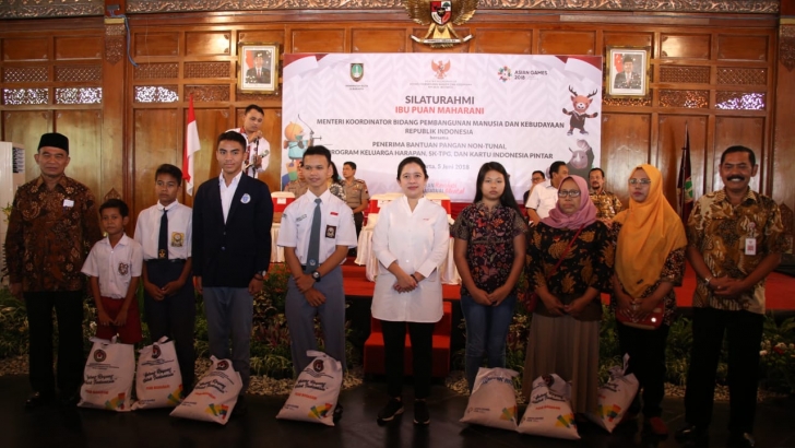 Surakarta (05/06)- Menteri Koordinator Bidang Pembangunan Manusia dan Kebudayaan (Menko PMK) Puan Maharani hari ini melaksanakan kunjungan kerja ke Kota Surakarta dan Kabupaten Boyolali Jawa Tengah. Dalam kunjungan di Kota Surakarta, Menko PMK menyerahkan berbagai bantuan di Balai Kota Surakarta, Selasa siang ( 5/6). Bantuan tersebut diberikan kepada seribu orang penerima manfaat program pemerintah yang terdiri atas 400 orang penerima PKH, 300 penerima BPNT dan 300 penerima KIP.