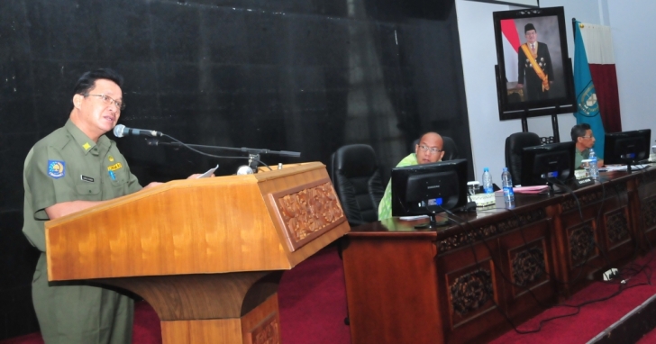 Pontianak, 24 Agustus, Gubernur Kalbar yang diwakili Asisten II Gubernur Kalbar Bidang Administrasi dan Kesra, Lenss Kandri (kiri) membacakan sambutan Gubernur Kalbar pada Rakor Evaluasi Pelaksanaan Enam Bulan Tanggap Darurat KLB Rabies yang terjadi di Kalbar, Senin,24/8/2015, di Ruang Rapat Balai Petitih, Pendopo Gubernuran Kalimantan Barat.