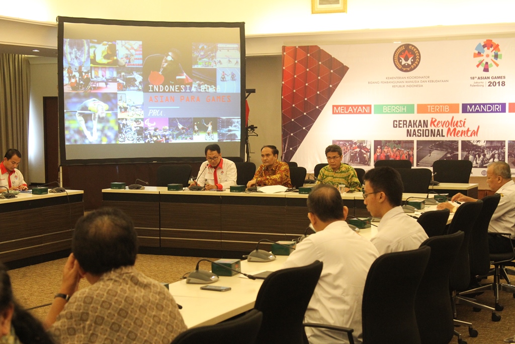 Jakarta(09/08)-- Untuk mengetahui sejauh mana persiapan pelaksanaan Asian Paragames 2018, Staf Ahli Menko PMK bidang Multikulturalisme, Restorasi Sosial dan Jati Diri Bangsa, Kemenko PMK, Haswan Yunaz hari ini memimpin rapat koordinasi persiapan penyelenggaraan Asian Paragames 2018, di lt.7 Gedung Kemenko PMK, Jakarta.