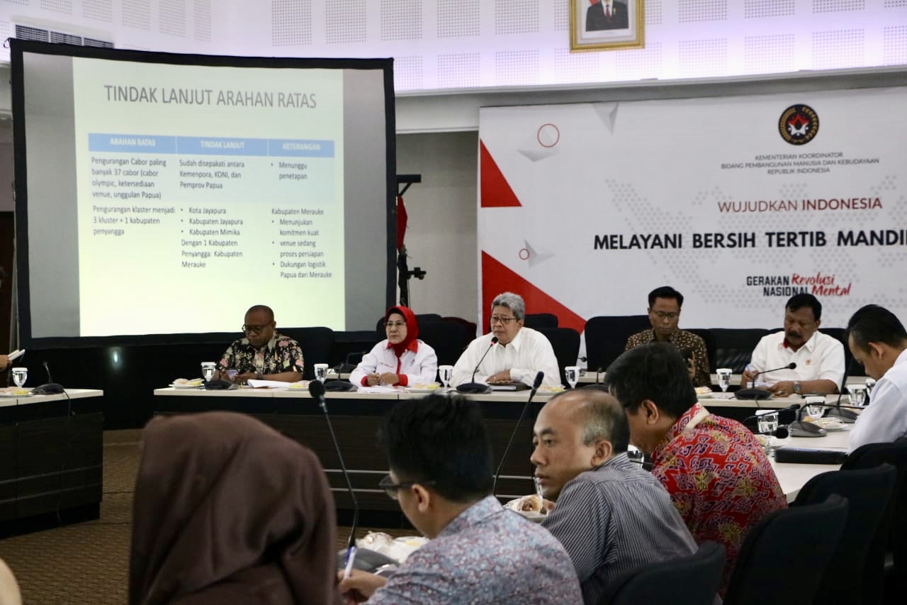 Jakarta (23/9)-- Kementerian Koordinator Bidang Pembangunan Manusia dan Kebudayaan (Kemenko PMK) mengadakan rapat mengenai persiapan penyelenggaran Pekan Olahraga Nasional (PON) ke 20 tahun 2020. Rapat dipimpin langsung oleh Deputi Bidang Koordinasi Kebudayaan Kemenko PMK, Nyoman Shuida.