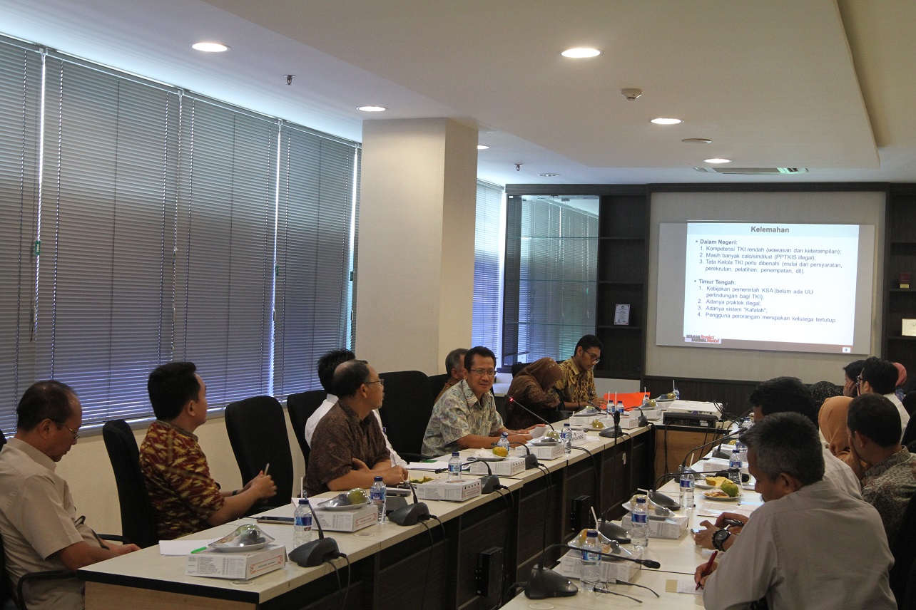 Jakarta (24/05)—Deputi bidang Koordinasi Perlindungan Perempuan dan Anak Kementerian Koordinator Bidang Pembangunan Manusia dan Kebudayaan, Sujatmiko, membuka dan memimpin rapat koordinasi (rakor) dalam rangka program tata kelola TKI oleh Arab Saudi. Rakor bertempat di ruang rapat lt.6, kemenko PMK, Jakarta. Sujatmiko menjelaskan latar belakang diadakannya rakor kali ini karena penempatan para Tenaga Kerja Indonesia (TKI) di kawasan negara-negara Timur Tengah didominasi oleh perempuan.