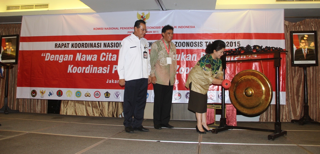 Jakarta (05/11)--- Menkes, Nila F Moeloek, memukul gong usai membuka secara resmi Rakornas Pengendalian Zoonosis tahun 2015 di Jakarta pagi ini, didampingi oleh Deputi III bidang Koordinasi Peningkatan Kesehatan, TB Rachmat Sentika, dan Dirjen P2PL Kemenkes, M. Subuh. Selain sebagai panelis, menkes juga membacakan sambutan Menko PMK, Puan Maharani.
