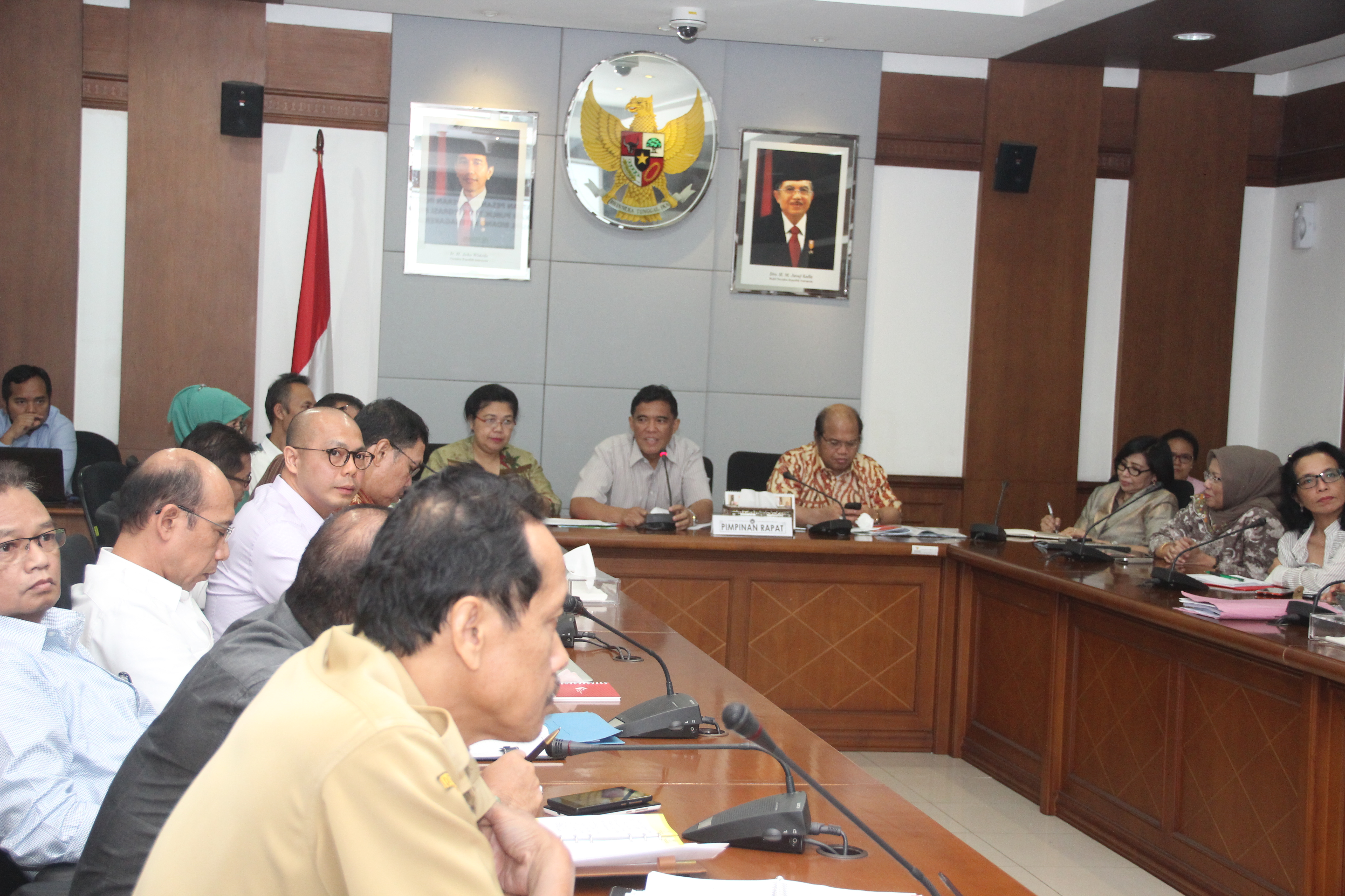 Jakarta, 15 Juli 2015 - Plt. Deputi Bidang Koordinasi Penanggulangan Kemiskinan dan Perlindungan Sosial, Tubagus Rachmat Sentika, memimpin Rapat Koordinasi Teknis " Koordinasi Publik Terintegrasi Jaminan Sosial Bidang Ketenagakerjaan", didampingi sebelah kanan Ketua DJSN Ghazali Situmorang dan sebelah kiri Asdep.II Urusan Jaminan Sosial Tini Martini, Rakornis tersbut dihadiri para K/L Kemenko PMK diantaranya Bappenas, Kemenaker Kemenkes, Kemenkominfo, Kemendagri, Kemendikbud, Kemenag, Kemendesa,PDT,Tarnmigrasi, DJSN, BPJS Ketenagakerjaan. (Humas/abdi)
