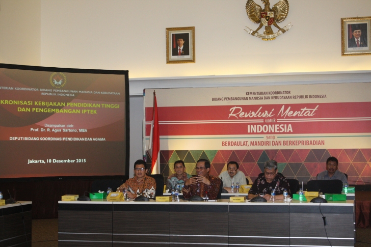 Jakarta, (10/12) - Deputi Bidang Koordinasi Pendidikan da Agama, Prof. Dr. R. Agus Sartono, MBA, didampingi Dirjen Sumberdaya Ristekdikti, Prof. Dr. Ali Ghufron Mukti dan Dirjen Kelembagaan Ristekdikti, Dr. Patdono Suwignjo memimpin FGD Sinkronisasi Kebijakan Dikti dan Pengembangan Iptek tanggal 10 Desember 2015 di Lantai 7 Kemenko PMK. (humas/Deputi IV)