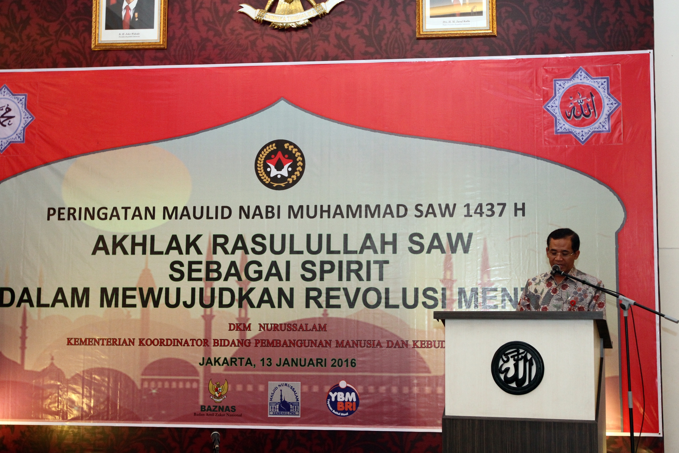 Jakarta, 13 Januari, Menko PMK Puan Maharani yang diwakili PLT Sesmenko PMK yang juga sebagai Deputi Menko PMK Bidang Koordinasi Pendidikan dan Agama, Prof.Dr.R.Agus Sartono, MBA., membacakan Sambutan Menko PMK pada acara peringatan Maulid Nabi Muhammad SAW, Rabu, 13/1/2016, di ruang Heritage Kemenko PMK, Jl. Medan Merdeka Barat No.3, Jakarta.