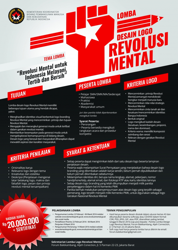 Kementerian Koordinator Bidang Pembangunan Manusia dan Kebudayaan (Kemenko PMK) mengadakan Lomba Desain Logo Revolusi Mental dengan tema 'Revolusi Mental untuk Indonesia Melayani, Tertib, dan Bersih'. Kemenko PMK membuka kesempatan seluas-luasnya kepada seluruh masyarakat Indonesia untuk mengikuti lomba ini.