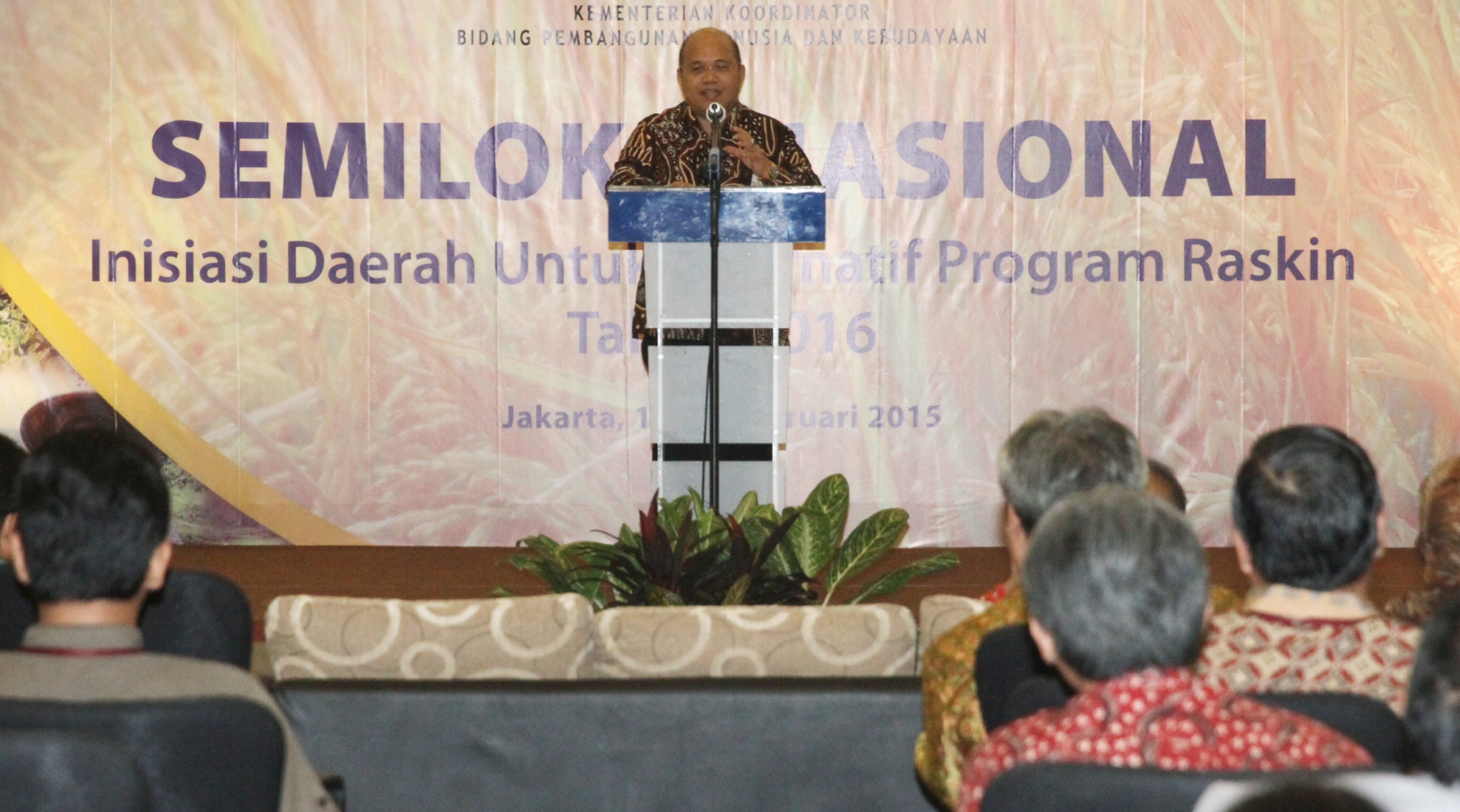 Jakarta (11/02) -- Deputi Menko PMK Bidang Koordinasi Perlindungan Sosial dan Perumahan Rakyat selaku Ketua Pelaksana Tim Koordinator Raskin Pusat Chazali Situmorang, membuka Semiloka Nasional Inisiasi Daerah untuk Alternatif Program Raskin Tahun 2016, di Kantor Kemenko PMK, Rabu (11/02). Acara ini terselenggara berkat kerjasama Kementerian PPN/Bappenas dan Institute for Promoting Sustainable Livelihood Approach (InProSuLA). (fik)