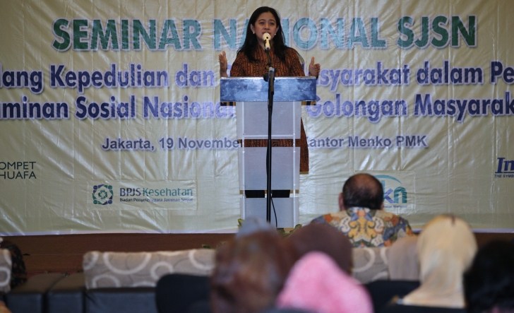 Jakarta, 19 Nopember - Menteri Koordinator Bidang Pembangunan Manusia dan Kebudayaan (Menko PMK) Puan Maharani memberikan sambutan sekaligus membuka secara resmi Seminar Nasional Sistem Jaminan Sosial Nasional dengan tema "Menggalang Kepedulian dan Peran Masyarakat dalam Pelaksanaan Sistem Jaminan Sosial Nasional untuk Golongan Masyarakat Rentan", Rabu (19/11/2014) di Jakarta.