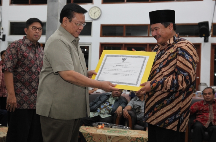 Garut (12/07) -- Menko Kesra Agung Laksono (kiri) memberikan bantuan kepada Bupati Garut Rudi Gunawan (kanan), dalam rangkaian Safari Ramadhan di Pendopo Kabupaten Garut. (foto : den)