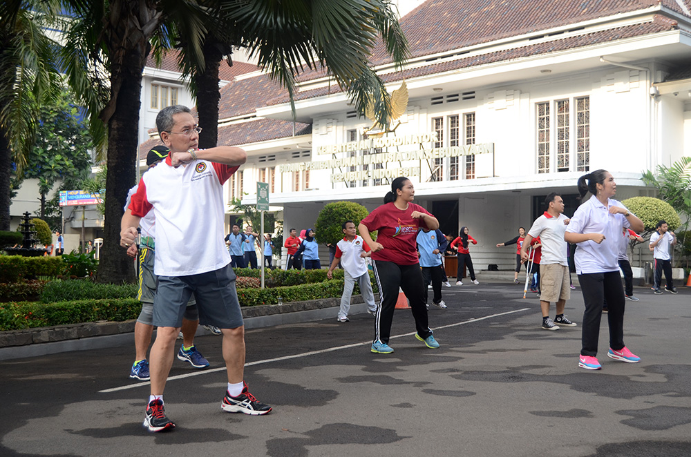 Acara yang dimulai dari pukul 07.00 wib hingga pukul 08.00 wib bertempat di halaman kantor Kemenko PMK diikuti oleh pejabat Eselon I,II,III,IV dan staf pelaksana di lingkungan Kementerian Koordinator Bidang Pembangunan Manusia dan Kebudayaan untuk pembinaan disiplin dan peningkatan kesehatan. foto;Anggunwahyu/dnovico/humas
