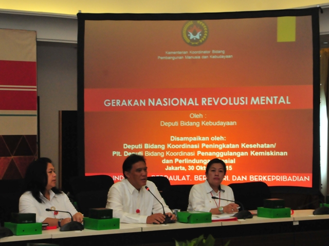 Jakarta (30/10)--- Deputi bidang Koordinasi Peningkatan Kesehatan (Dep. III) yang juga Plt. Deputi bidang Koordinasi Penanggulangan Kemiskinan dan Perlindungan Sosial (Dep. II), TB Rachmat Sentika (tengah), siang ini membuka sekaligus menyampaikan paparan mendalam tentang Gerakan Nasional Revolusi Mental. Acara yang berlangsung di Ruang Rapat Utama Kemenko PMK, Lt.7 ini dihadiri oleh para pejabat dari K/L yang dikoordinasikan oleh Kedeputian III dan II Kemenko PMK.