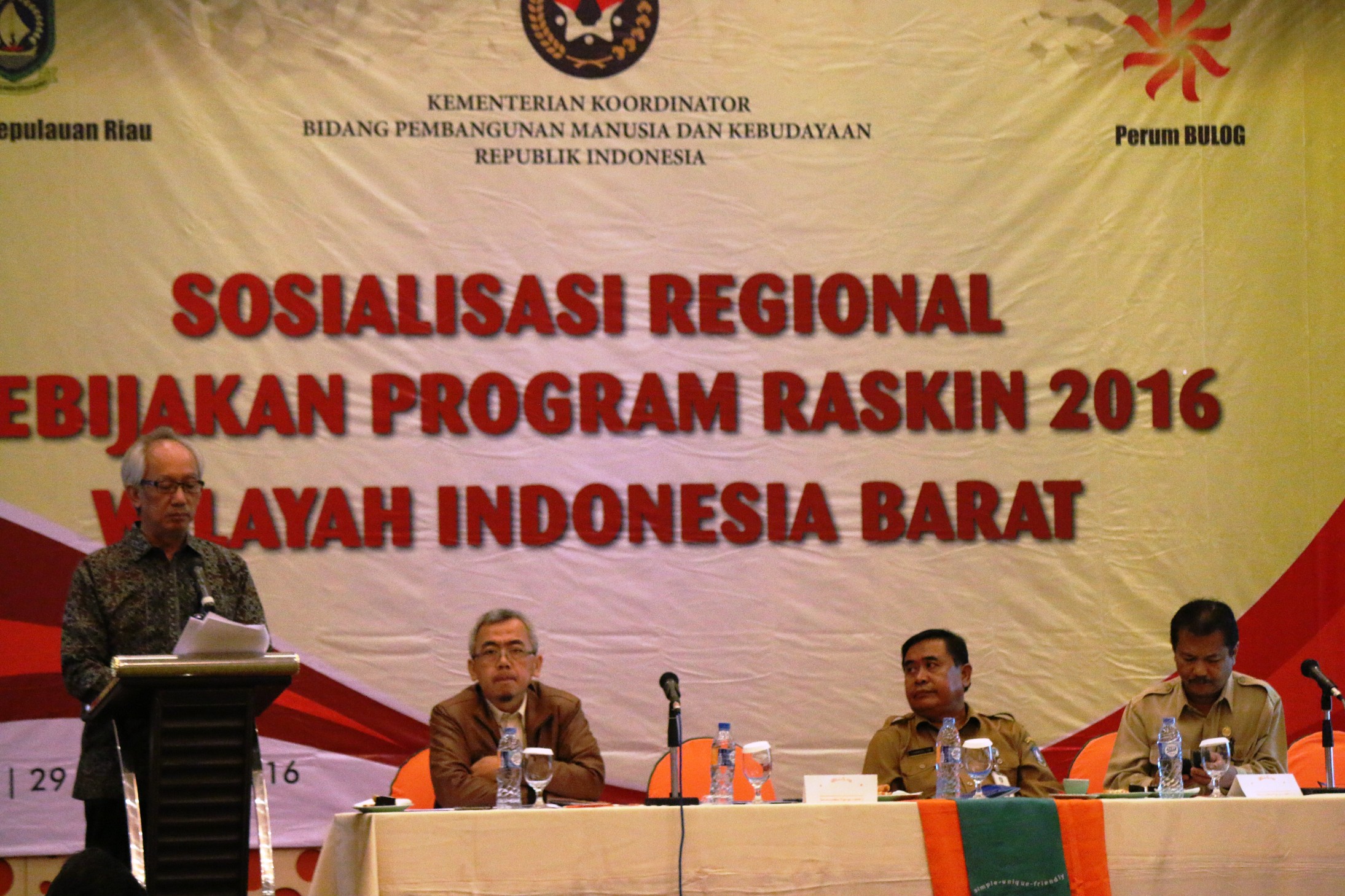 Batam, (29/2)—Deputi Menko PMK Bidang Koordinasi Penanggulangan kemiskinan dan Perlindungan Sosial, Tubagus Achmad Choesni memberikan sambutan pada pembukaan acara Sosialisasi Regional Kebijakan Program Raskin 2016 Wilayah Indonesia Barat, di Batam, senin pagi (29/2).