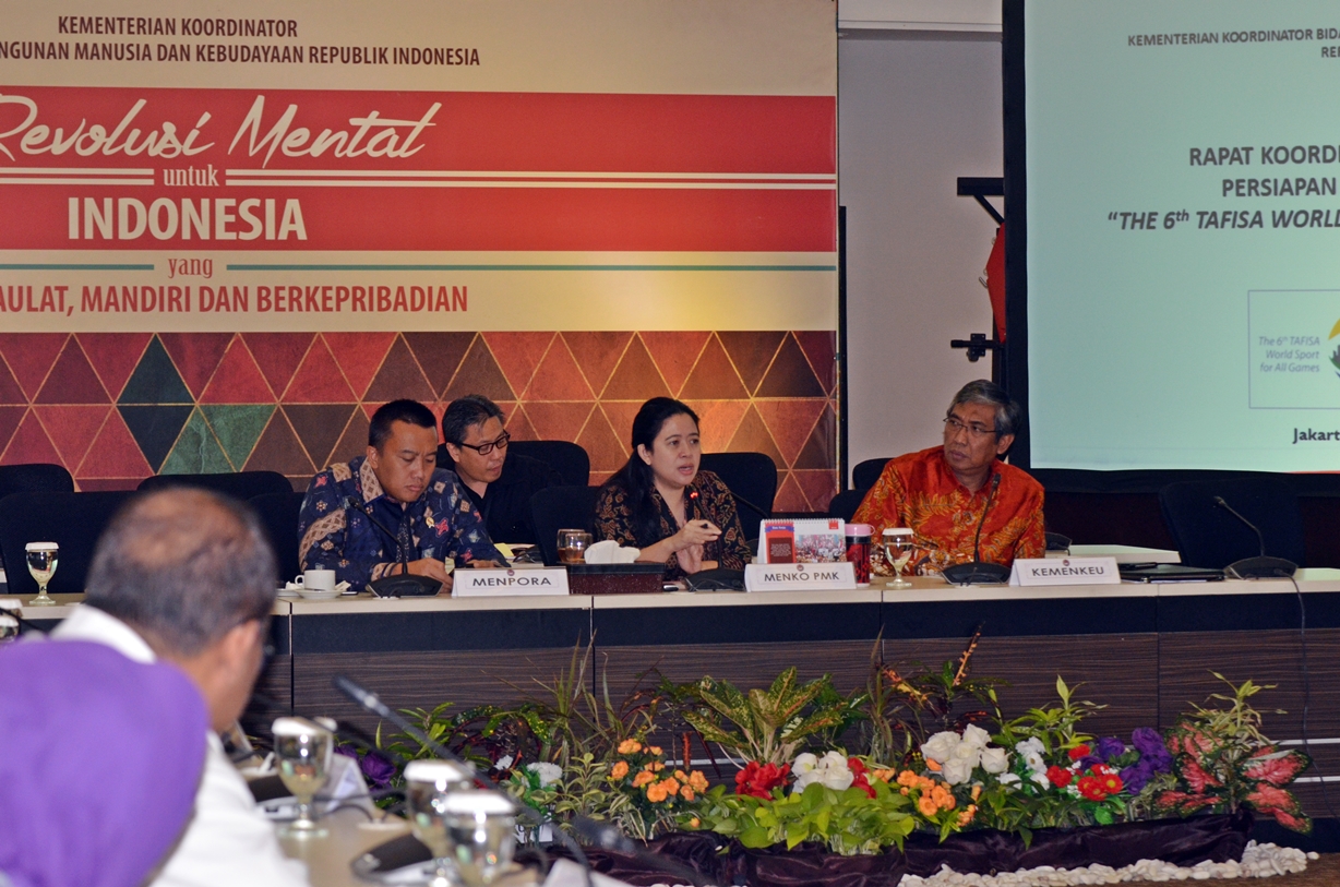 Jakarta (31/08) – Menteri Koordinator Bidang Pembangunan Manusia dan Kebudayaan (Menko PMK) Puan Maharani, memepin rapat koordinasi (Rakor) persiapan penyelenggaraan The Association For International Sport For All (Tafisa) World Sport 2016 yang akan diselenggarakan di Indonesia akan dilaksanakan pada tanggal 6-12 Oktober 2016.