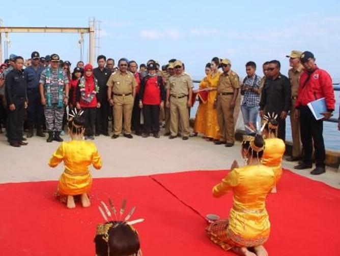 Konawi Kepulauan, 9 September 2015 - Ketua Tim Ekspedisi Bhakti Kesra Nusantara (Bhakesra) V 2015 Tuti Nuryamati bersama dengan Komandan KRI Banda Aceh dan Bupati Konawe Kepulauan Burhanudin disambut tarian tradisional saat tiba pelabuhan penyebrangan feri Langara, Kecamatan Wawoni Barat, kabupaten Konawe Kepulauan, Rabu pagi, (9/9). (yn)