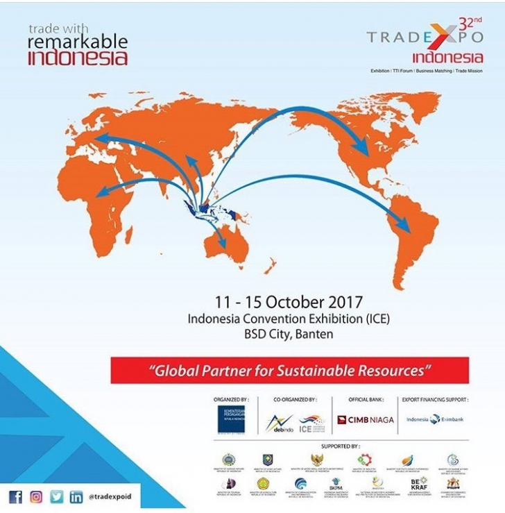 Serpong, 11 Oktober 2017 – Pameran dagang skala internasional terbesar di Indonesia, Trade Expo Indonesia (TEI) 2017 resmi dibuka Presiden RI Joko Widodo hari ini, Rabu (11/10) di Indonesia Convention Exhibition Bumi Serpong Damai (ICE BSD), Tangerang, Banten. Dengan mengusung tema “Global Partner for Sustainable Resources” Menteri Perdagangan Enggartiasto Lukita yakin Indonesia telah siap menjadi mitra penyedia sumber daya yang berkesinambungan bagi pelaku usaha dunia, yang ingin semakin menancapkan kuku di kancah perdagangan global.
