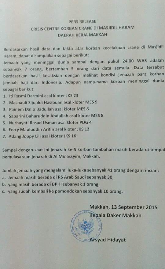 Jakarta (13/9) -- Jumlah jemaah haji Indonesia korban robohnya crane di Masjidil Haram terus bertambah ,sesuai data yg diterima Humas Kemenko PMK dari data yg dikeluarkan Kepala Daerah Kerja Mekkah Arsyad hidayat jumlah jemaah Indonesia yg tewas mencapai 7 orang. Terlampir siaran pers yang diterima Humas Kemenko PMK.