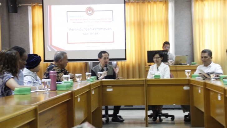 Surabaya (4/10) -- Deputi Bidang Koordinasi Perlindungan Perempuan dan Anak Kemenko PMK, Ghafur Dharmaputra didampingi Asisten Deputi Pemberdayaan Perempuan Kemenko PMK, Wagiran menyampaikan Sosialisasi  Peningkatan Peran Sivitas Akademika dan Mahasiswa Fisip Universitas Airlangga (Unair) dalam Perlindungan Perempuan dan Anak. Sosialisasi dilaksanakan di ruang rapat Fisip Unair, Surabaya, Jum'at pagi (4/10).