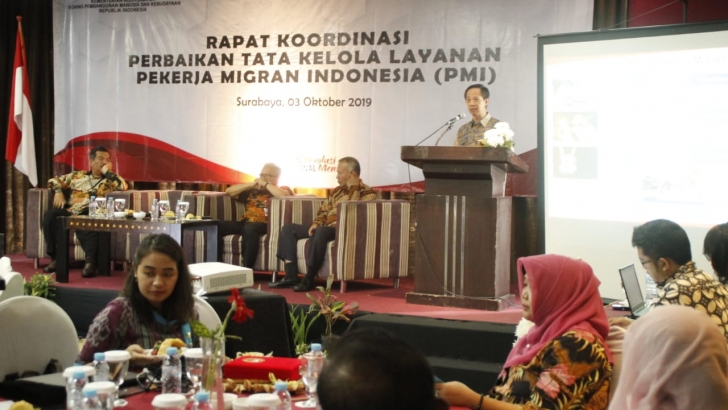Surabaya (3/10) -- Deputi Bidang Koordinasi Perlindungan Perempuan dan Anak Kemenko PMK, Ghafur Dharmaputra memberikan arahan pada Rapat Koordinasi Perbaikan Tata Kelola Layanan Pekerjaan Migran Indonesia (PMI). Rapat diselenggarakan di Surabaya dan diikuti oleh perwakilan SKPD terkait tingkat Provinsi/Kota Surabaya, Perangkat Daerah tingkat Kecamatan/Kelurahan/Desa di Kota Surabaya, LSM, Pengerah PMI, serta Dinas Tenaga Kerja Kabupaten/Kota se Jawa Timur.